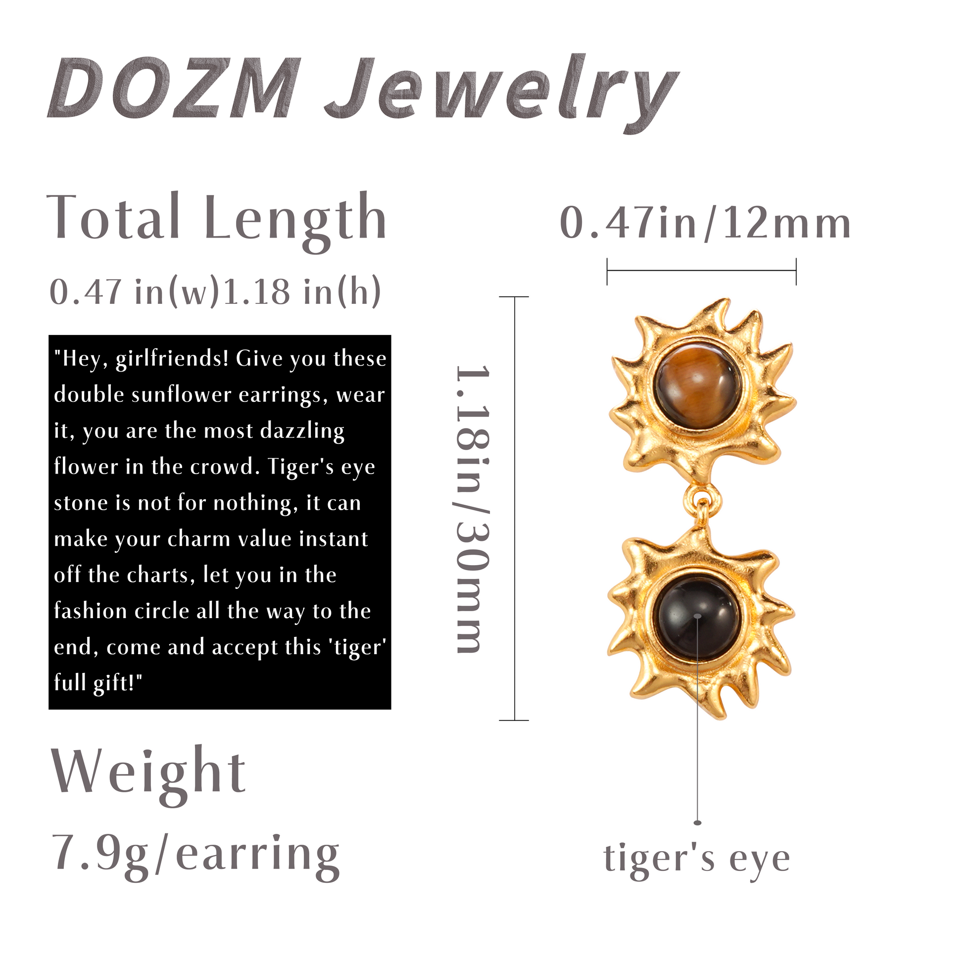 Unleash your inner radiance with DOZM's Double Sunflower Tiger's Eye Earrings—a vibrant fusion of nature-inspired design and mystical energy. Featuring captivating tiger's eye stones renowned for their grounding properties and golden shimmer, these earrings are set in a 24K gold-plated brass sunflower motif measuring 0.47" (12mm) wide and 1.18" (30mm) long. Weighing just 7.9g per earring, they offer a bold yet lightweight statement for those who dare to stand out.