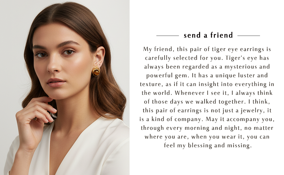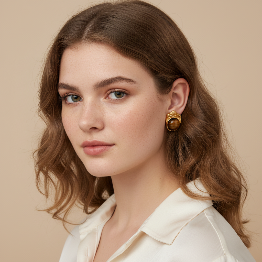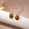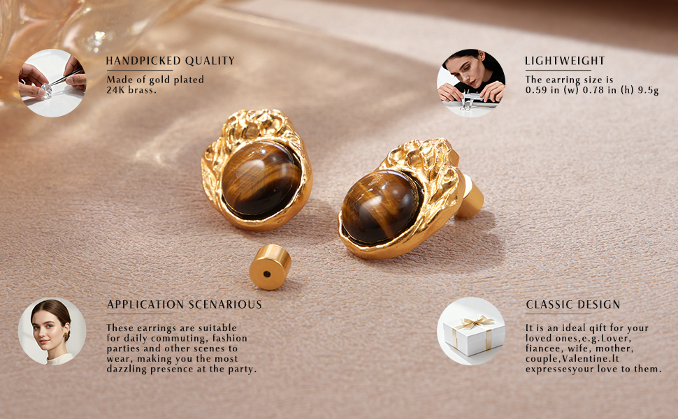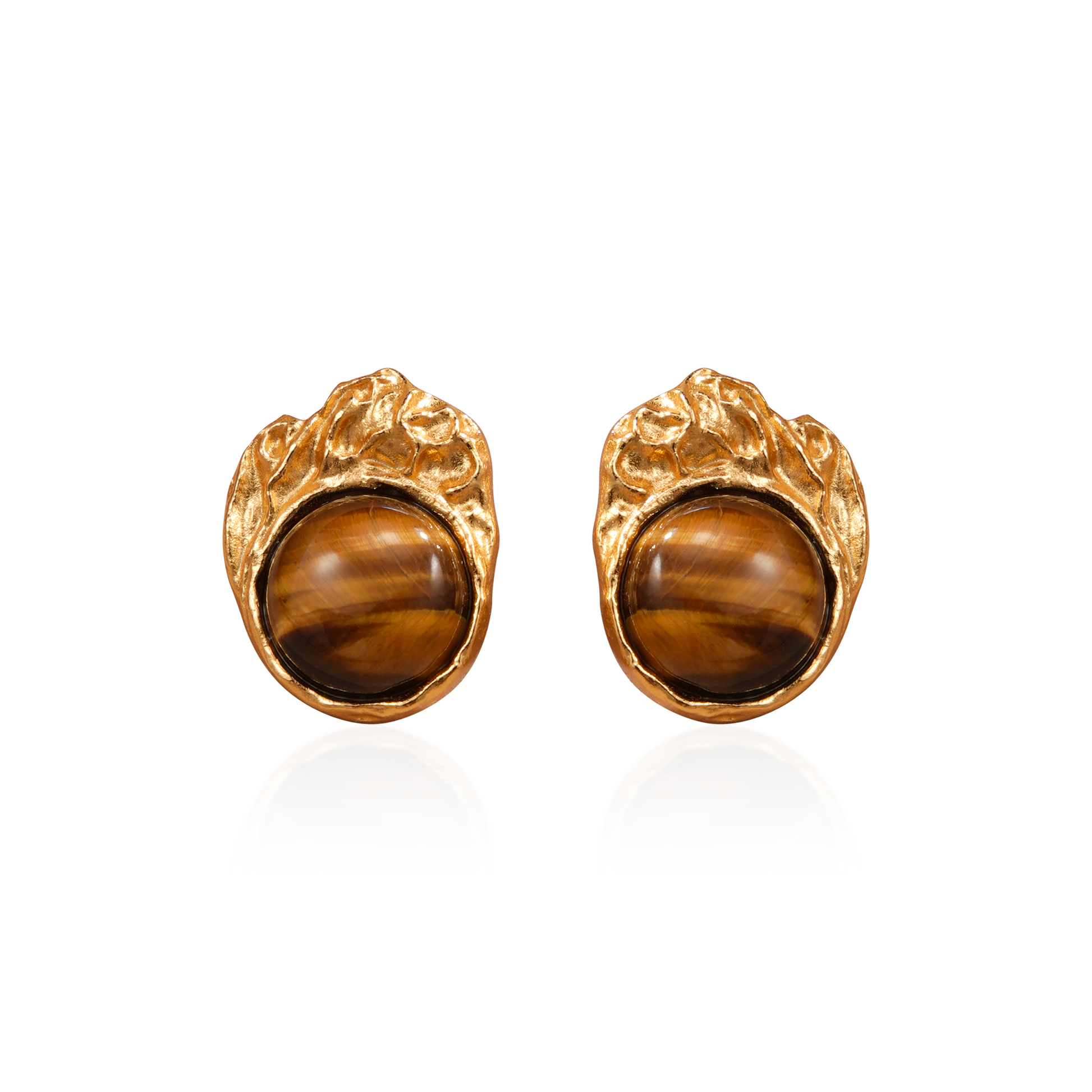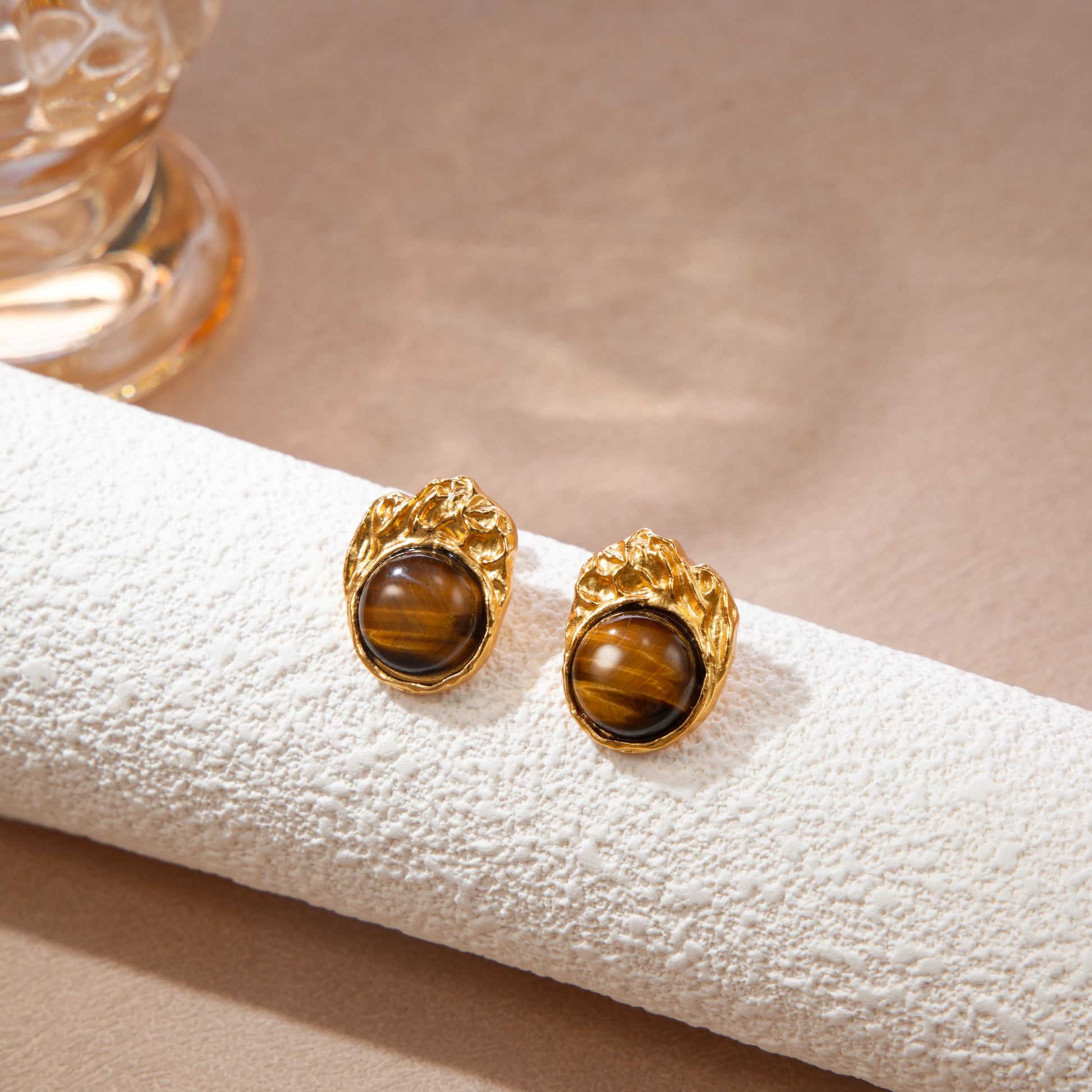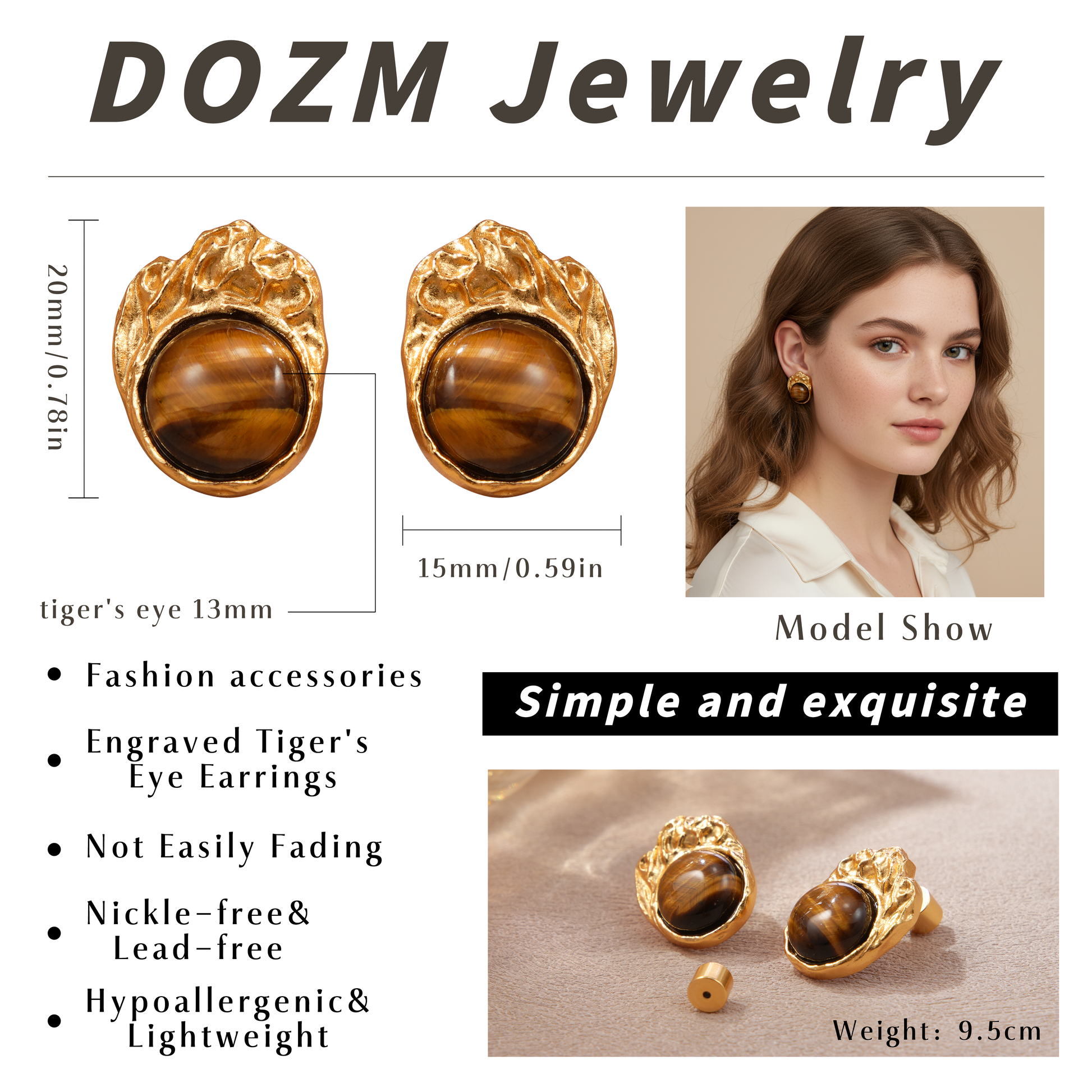 Unlock the power of elegance and mystery with DOZM's Engraved Tiger's Eye Earrings. Meticulously crafted from 24K gold-plated brass, these exquisite earrings feature a genuine 13mm tiger's eye stone, known for its captivating depth and unique natural patterns. Measuring 0.78 inches in height and 0.59 inches in width, these lightweight (9.5g) earrings combine symbolic strength with everyday versatility, making them perfect for both daily wear and special occasions.